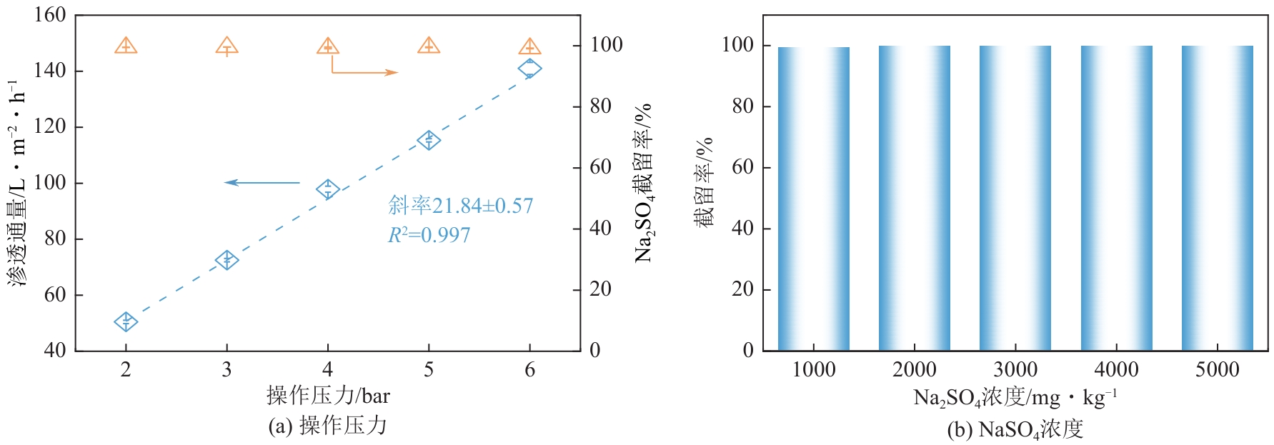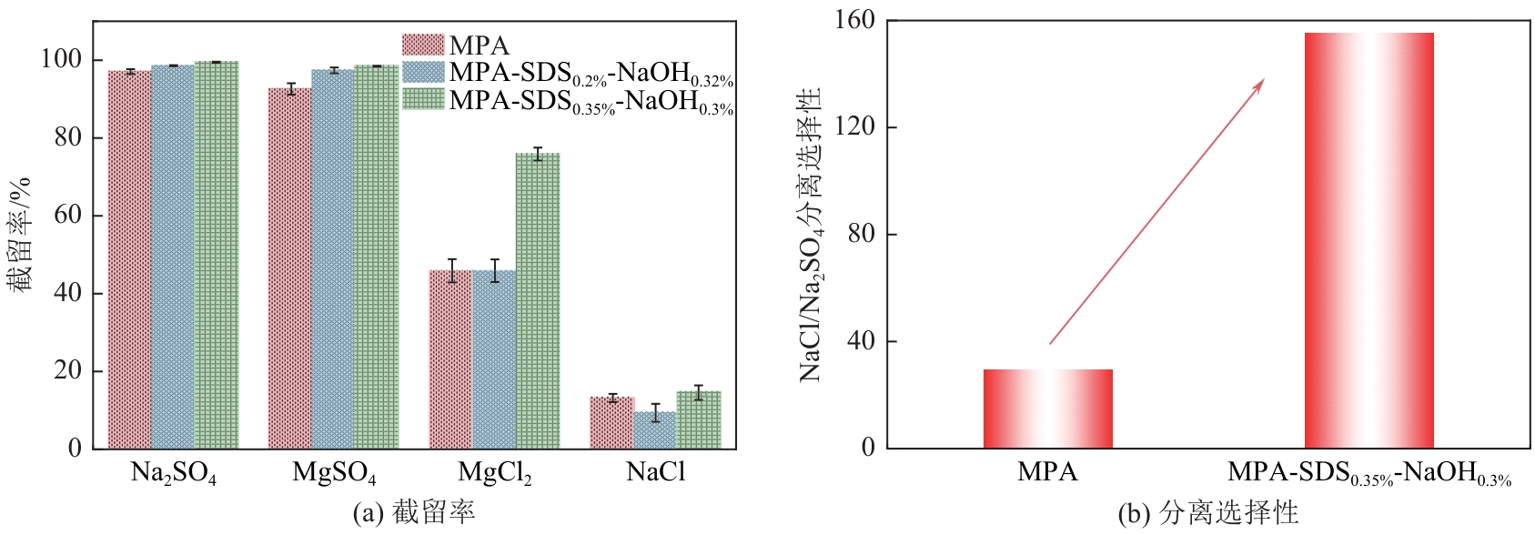 针对传统聚酰胺复合(TFC-PA)纳滤(NF)膜溶剂渗透性和溶质分离选择性相互制约、无法同时提升的问题,本文从界面聚合调控出发,由适当比例表面活性剂十二烷基硫酸钠(SDS)和强碱(NaOH)组成二元调节剂。其中,SDS单分子层通过静电作用富集哌嗪(PIP),包裹有机酰氯避免其被NaOH水解,同时降低界面张力,加快PIP分子跨界面均匀扩散,提高界面聚合的速度和均匀性;适量的NaOH吸酸保持SDS的表面活性,同时去质子化活化PIP,加快界面聚合速度,形成均匀聚酰胺分离层。这种协同增强效应使在水相溶液含有0.35%(质量体积浓度)SDS和0.3%(质量体积浓度)NaOH条件下,生成的聚酰胺复合膜MPA-SDS-NaOH与TFC-PA NF膜相比,聚酰胺层交联度从44.8%提高到88.4%,孔径分布变窄的同时,厚度从125nm降到42nm,渗透通量从的6.04L/(m2·h·bar)提高到19.20L/(m2·h·bar)(1bar=0.1MPa),NaCl和Na2SO4的单盐分离选择性也从29.4上升到152.6,实现了膜渗透通量和分离选择性的同时提升。SDS和NaOH协同补偿调控策略为制备高渗透选择性脱盐聚酰胺纳滤膜提供了新的思路。