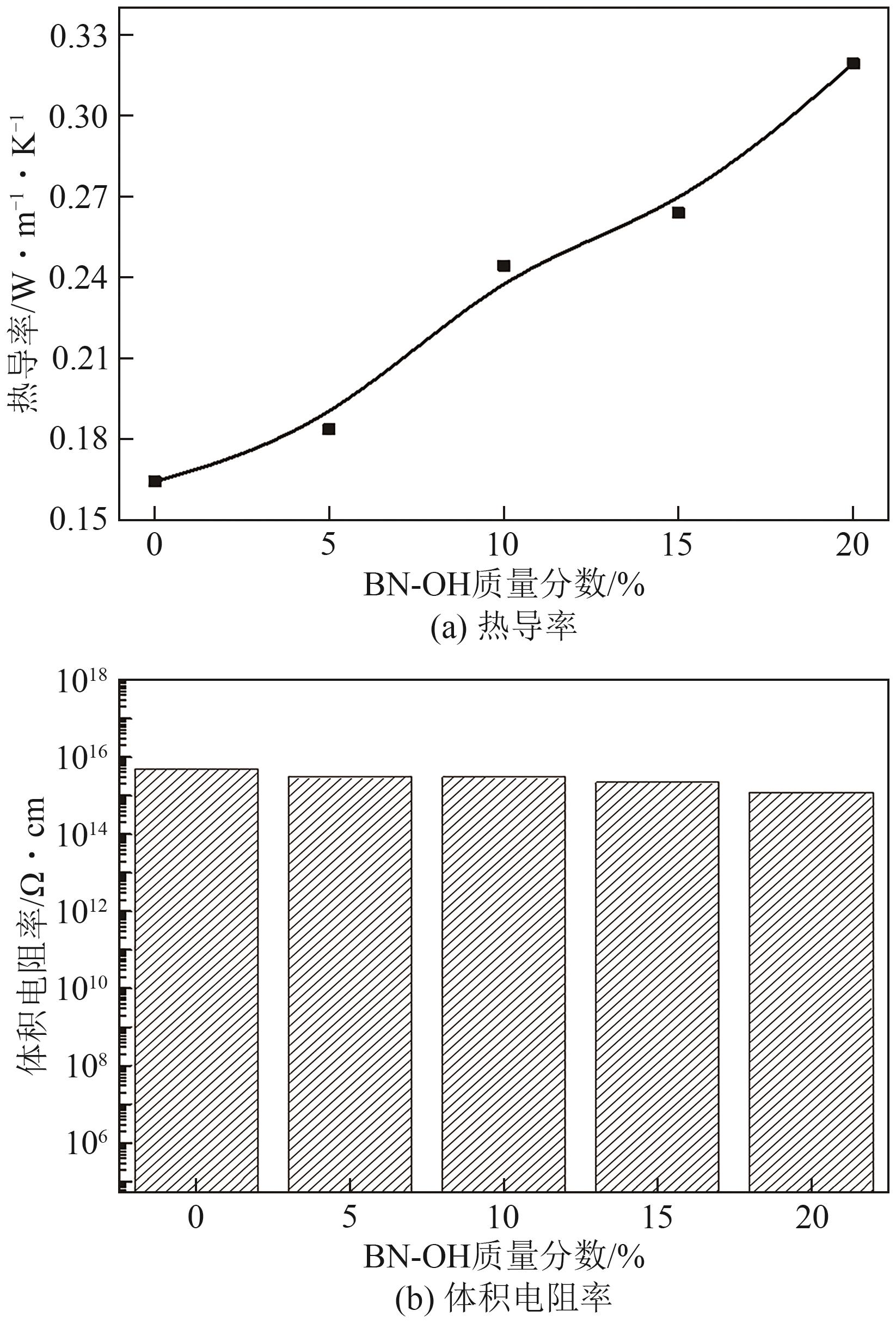 采用葡萄糖辅助球磨六方氮化硼(BN),通过B—O化学键将葡萄糖成功接枝在BN分子上,制备得到BN-OH纳米片。将不同含量的BN-OH纳米片与天然胶乳(NR)粒子通过胶乳共沉淀制备得到了均匀的隔离网络结构,在NR胶乳粒子周围蛋白质的辅助下BN-OH纳米片与NR分子链通过氢键等形成了物理交联。考察了BN-OH纳米片的含量对BN-OH/NR纳米复合材料的交联密度、机械性能、导热性能和气体阻隔性能等的影响。在一定范围内,随BN-OH纳米片填充量的增加,BN-OH/NR纳米复合材料的拉伸强度、定伸应力增加,储能模量上升,损耗因子下降,表明BN-OH纳米片良好的补强作用和强两相界面结合作用力。BN-OH纳米片良好地分散。形成的隔离网络结构以及蛋白质辅助物理交联所形成的强有力的界面相互作用,阻隔了气体分子的扩散,同时热量沿搭接在一起的BN-OH纳米片释放出去,致使BN-OH/NR复合材料良好的导热性能和气体阻隔性能。20% BN-OH/NR纳米复合材料的热导率为0.319W/(m·K),为导热材料,较纯NR的热导率提升了94%。而不同含量的BN-OH/NR纳米复合材料的体积电阻率仍远高于绝缘临界电阻率的标准,即本文制备的绝缘、高机械性能、高导热和良好密封性能的橡胶复合材料有望应用于电子元器件、电池、汽车等领域的热界面材料。