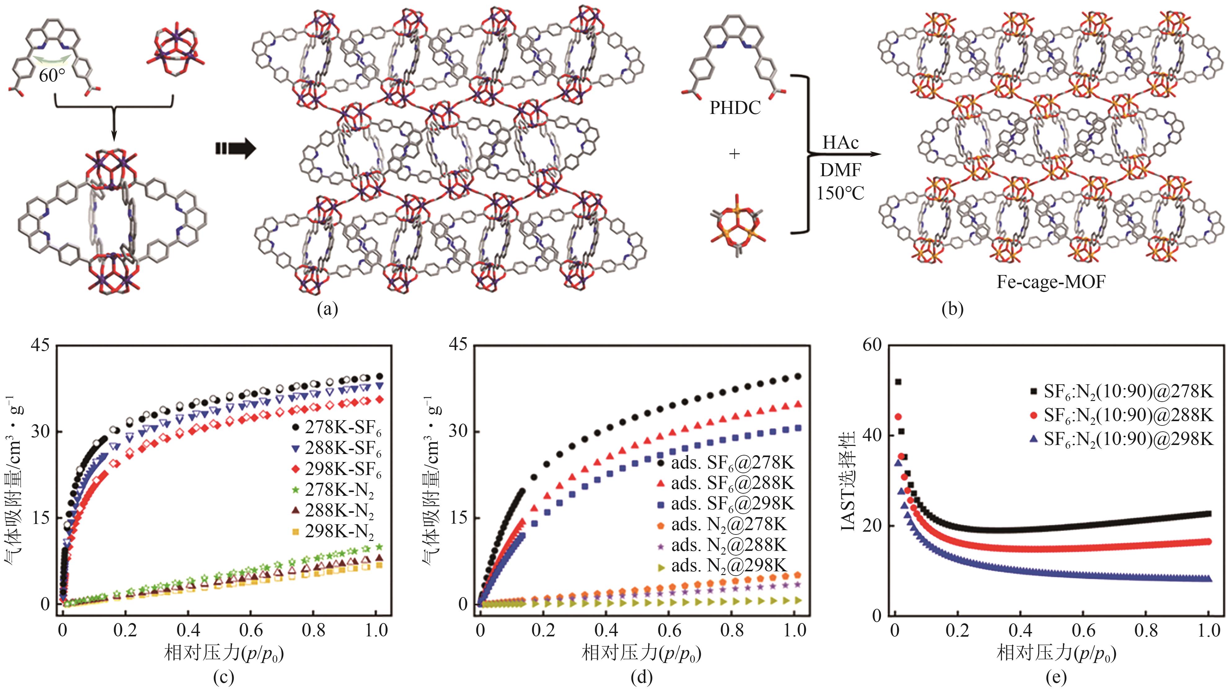 图5 Ni(pba)2和Ni(3-mpba)2的晶体孔结构(a);DFT模拟的Ni(pba)2和Ni(3-mpba)2对SF6和N2作用位点示意图(b);Ni(pba)2(c)和Ni(3-mpba)2(d)在298K下对SF6和N2的吸附等温线;Ni(3-mpba)2在298K下对SF6/N2(10/90)穿透曲线(e)[51]