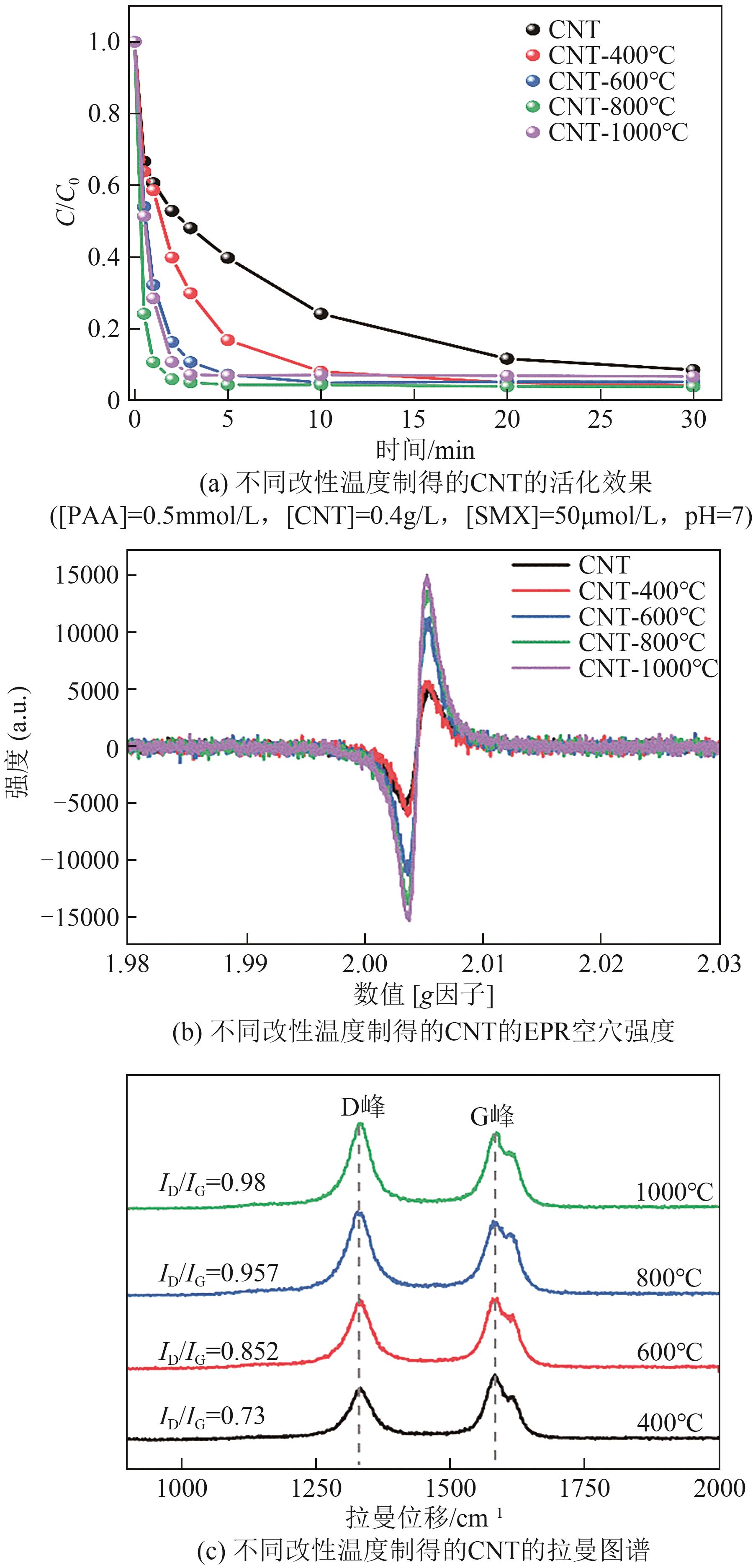 唑(SMX),5min内SMX去除率达97%。pH对该体系的处理效果有影响,中性条件下处理效果最佳。通过比较在不同加热温度下制得的CNT对目标污染物的降解效果,确定了最佳改性条件为800℃。采取电子顺磁共振(EPR)、淬灭实验、电化学实验等手段探究了该体系中污染物的降解机理。在热改性CNT/PAA体系中对SMX降解起主要作用的是单线态氧(1O2)而非羟基自由基(·OH),有机自由基起次要作用,电子转移过程(ETP)也为SMX的降解做出贡献。循环实验表明,通过对使用后的CNT再次热改性可以恢复材料表面的缺陷程度,被占据的活性位点再次空出从而参与反应,因此热改性CNT/PAA体系循环使用5次依旧对SMX保持较高的处理效率。本研究聚焦于热改性CNT活化PAA的作用机理及活化位点,为将基于碳材料活化过氧乙酸的高级氧化工艺应用于实际水环境修复提供了更多理论依据。