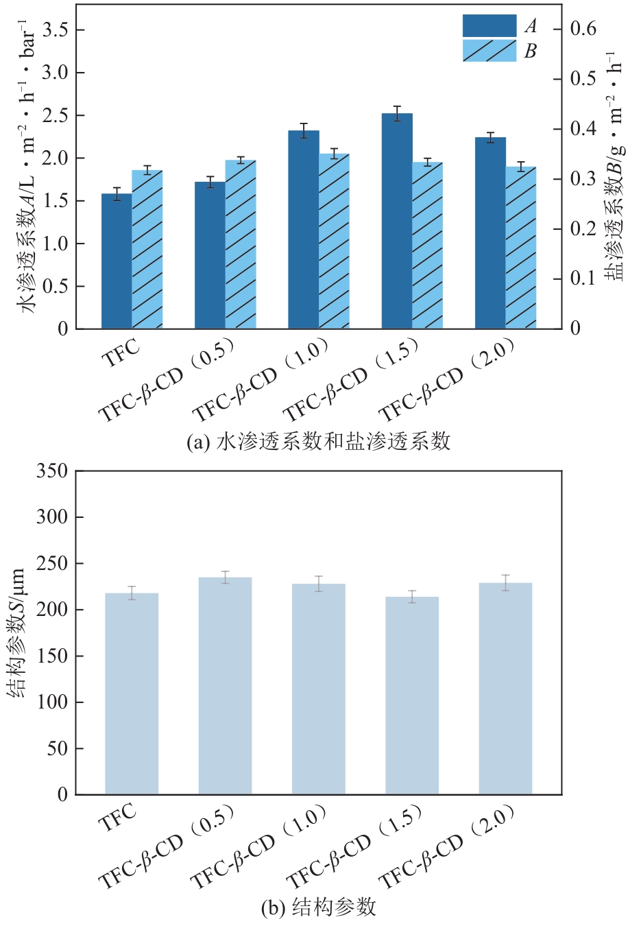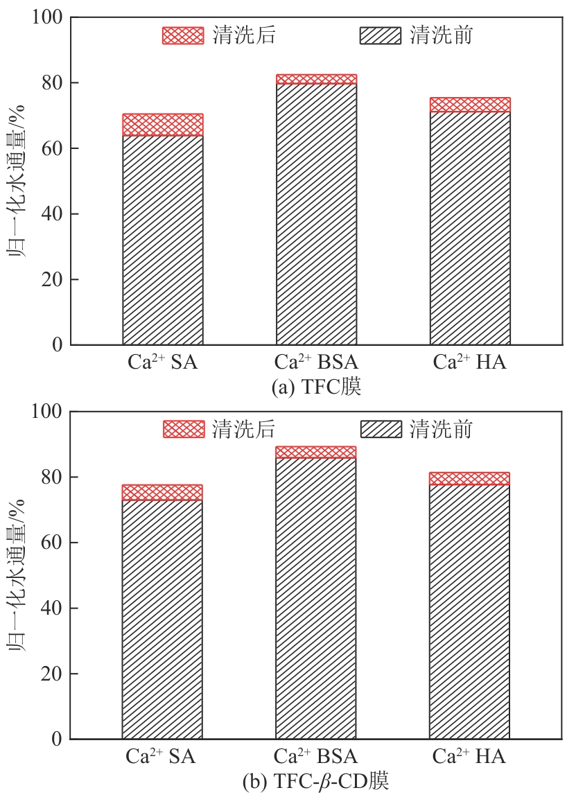 采用在水相中引入添加剂调控界面聚合过程的方法对聚酰胺薄膜复合材料(TFC)的活性层进行原位改性,以突破渗透性与选择性之间的“trade-off”效应以及提升膜的抗污染性能。首先,通过相转化制备聚砜(PSF)支撑层,在此基础上通过在界面聚合中掺入水相添加剂β-环糊精(β-CD)原位构筑TFC-β-CD改性正渗透膜。β-CD外部存在亲水性羟基基团,可与酰氯基团进行界面聚合产生聚酯结构而被牢固保留在膜中,并且其携带的纳米空腔结构是一种高效传质通道,使其在提升膜水通量的同时保持高截留率。通过扫描电子显微镜(SEM)、傅里叶变换红外光谱(FTIR)和原子力显微镜(AFM)分析了改性前后的膜表面结构、组成和粗糙度,利用错流式实验装置考察了膜的传质性能和结构参数,并探究了膜的抗有机污染性能和膜污染可逆性。结果表明:TFC-β-CD(1.5)改性膜的水接触角由(62.6±1.52)°下降至(44.9±0.52)°,亲水性显著提升,且粗糙度降低。在有机污染实验中,与TFC膜相比,当3种特征污染物的原料液不含Ca2+时,TFC-β-CD改性膜的通量恢复率在90%以上,当原料液含Ca2+时,TFC-β-CD改性膜的不可逆污染程度较轻,具有较好的抗污染性能。