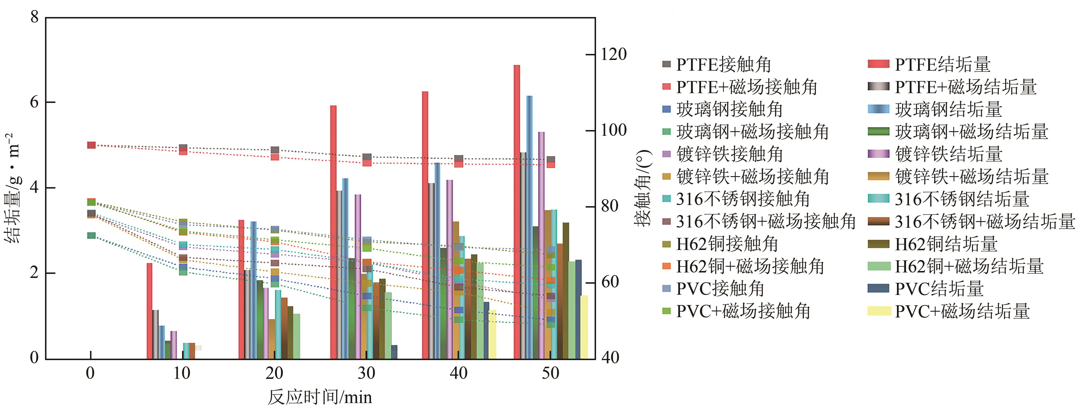 | PVC+磁场 | 蒸馏水 | 78.95 | 78.39 | 77.59 | 77.20 | 76.95 | 76.10 |
