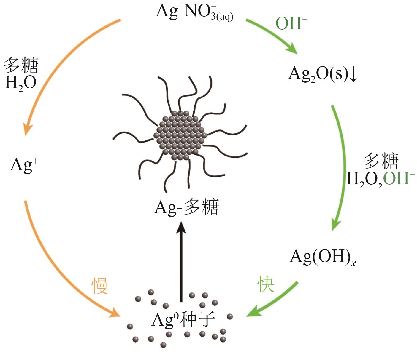 | 核桃壳多糖 | 羟基Ag—O配位键 | 尺寸15.87nm,负载量达19.81%,20天仅释放2×10-7 | [ |