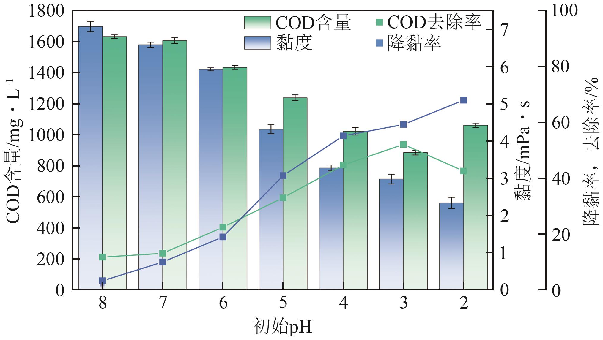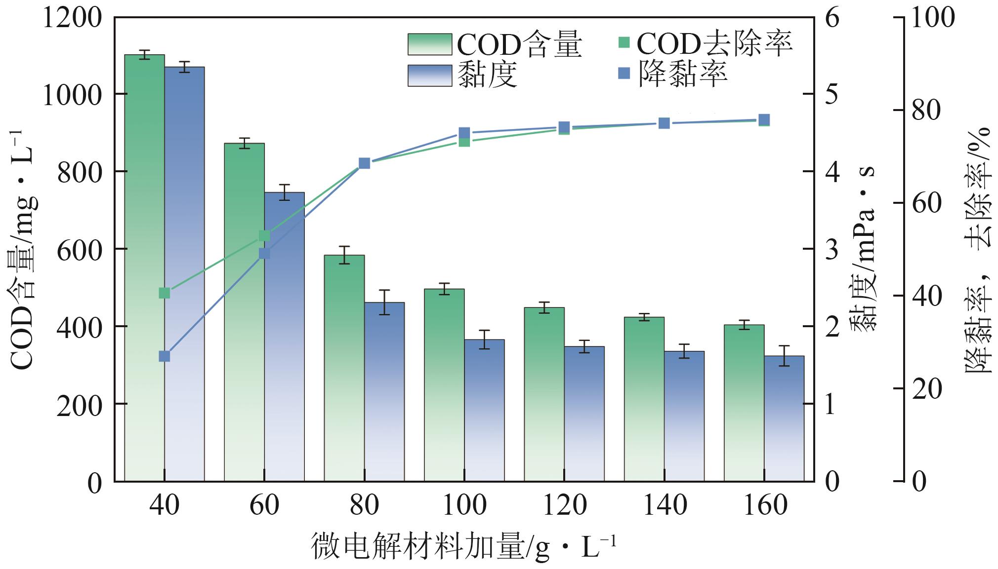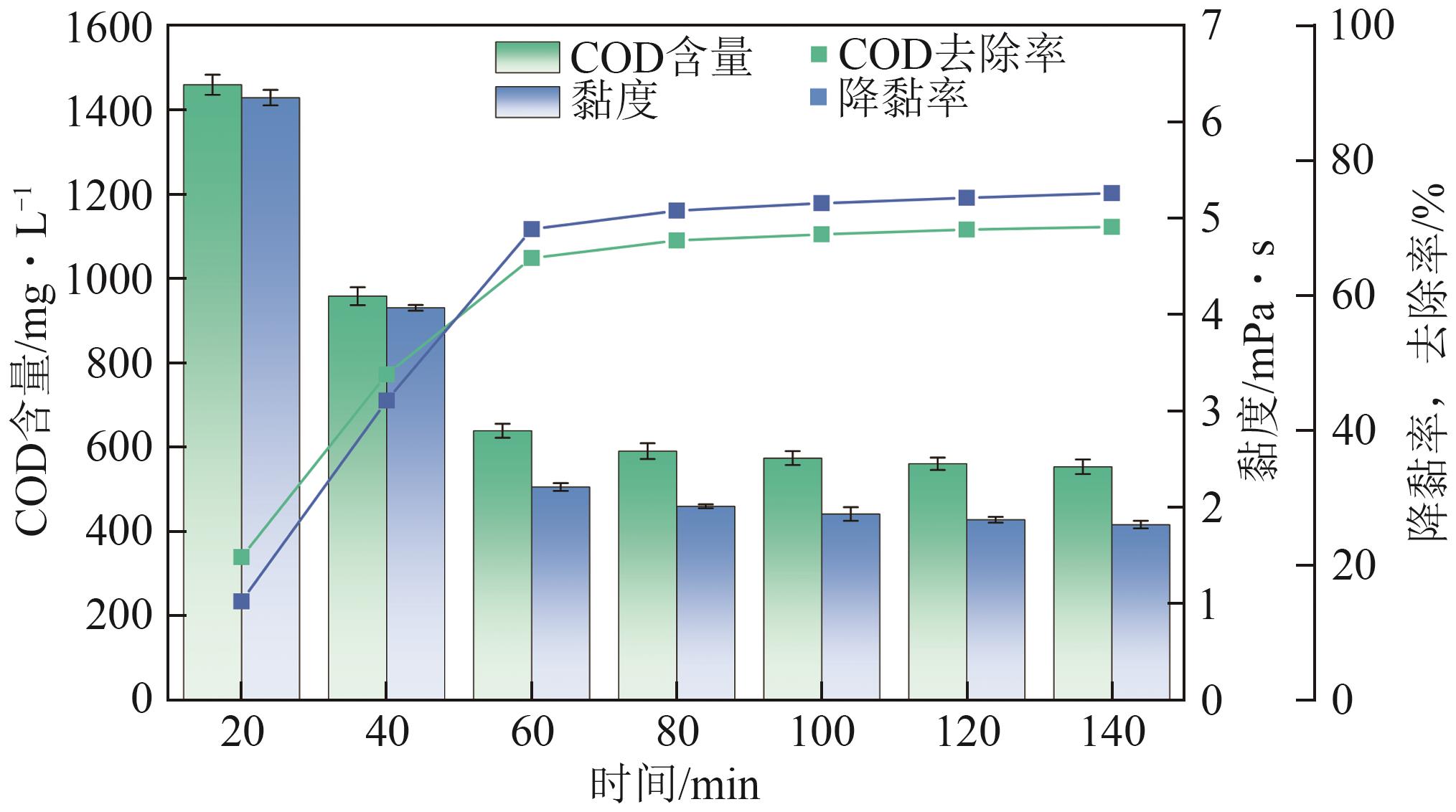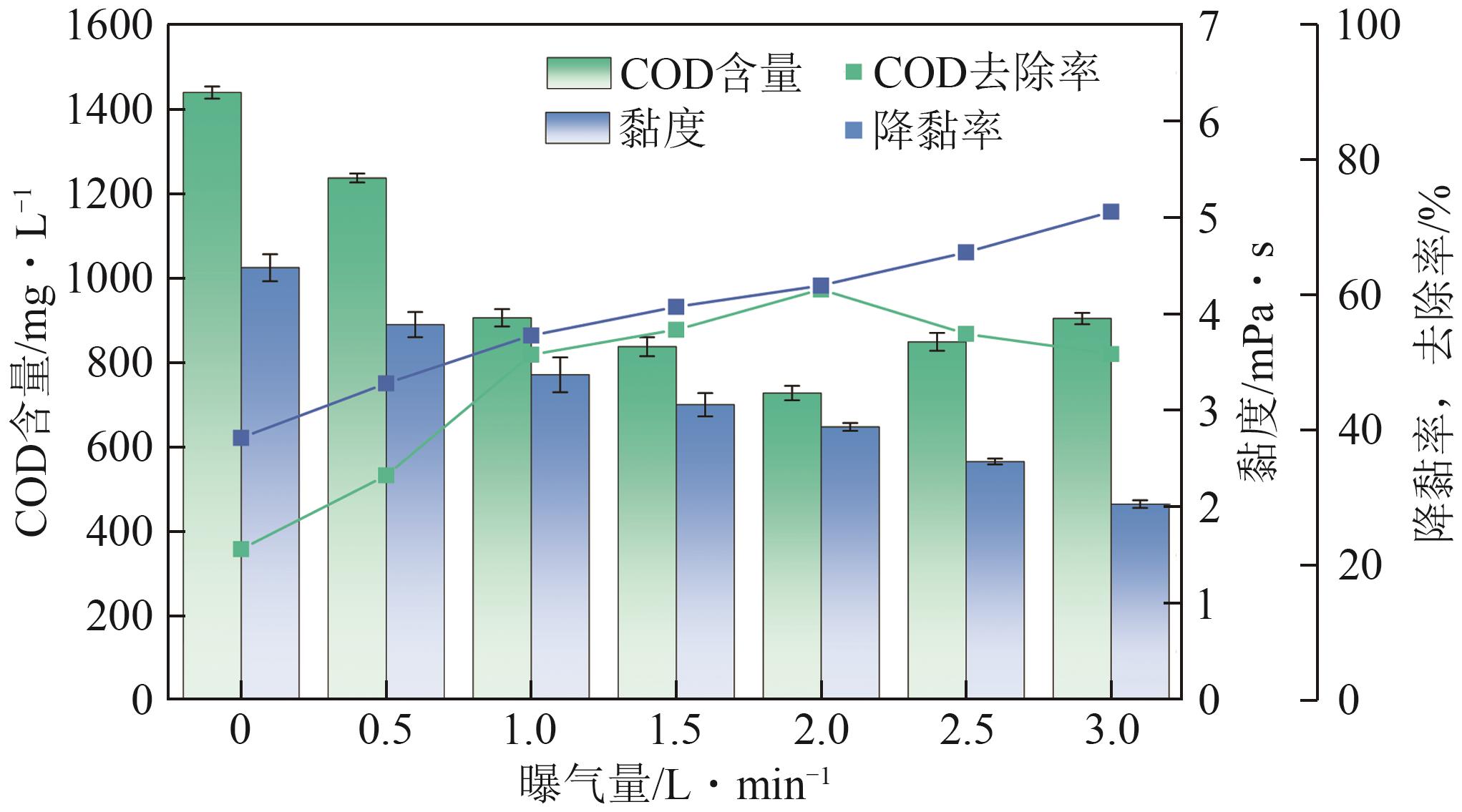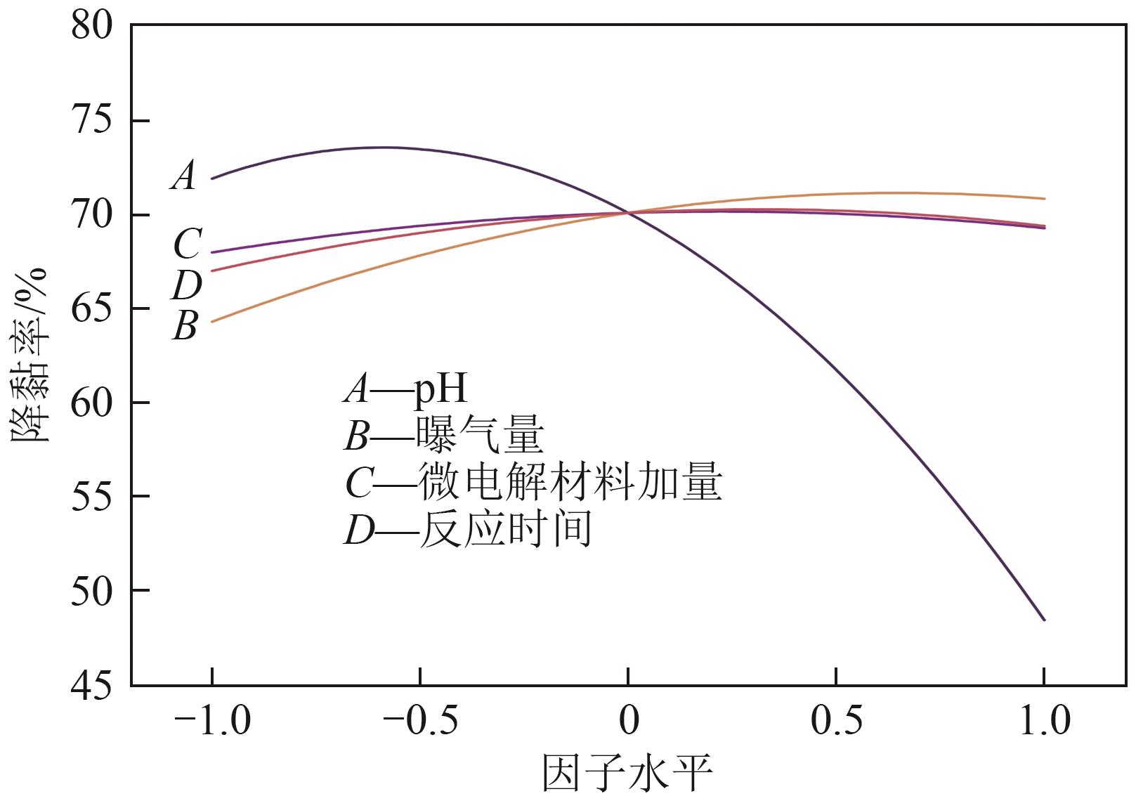 | 序号 | pH | 曝气量/L·min–1 | 微电解材料加量/g·L–1 | 反应时间/min | COD去除率/% | 降黏率/% |