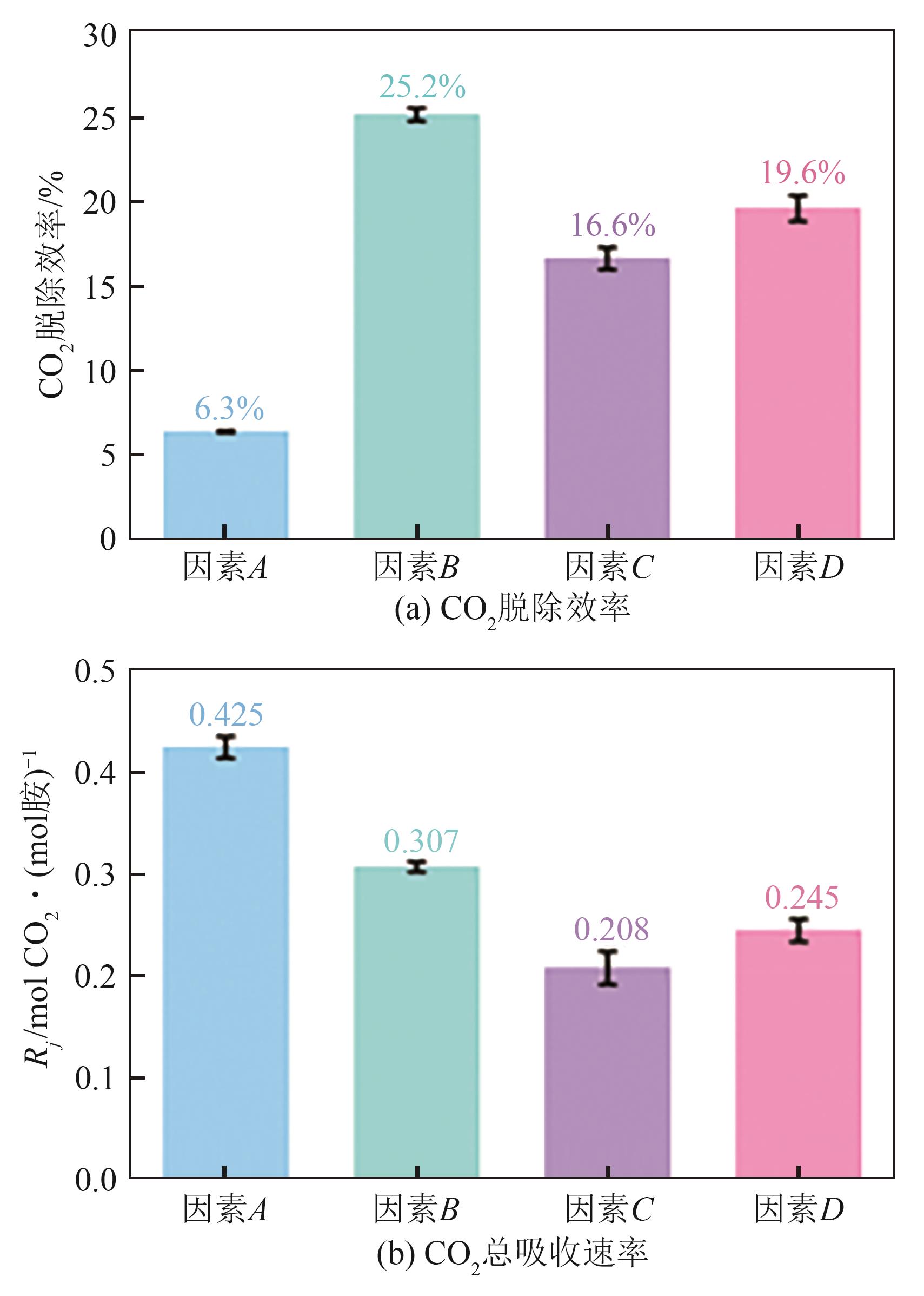 | 实验编号 | 因素 | CO2脱除效率(Ψ)/% | 总吸收速率(φ)/ kmol·m-3·h-1 | |||