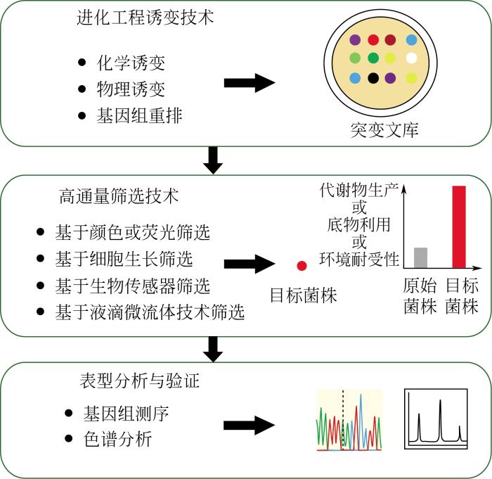 ... 过去几十年,菌种进化工程研究和应用取得了很多突破性的进展,研究人员开发了一系列物理、化学诱变技术实现了不同基因尺度的微生物进化[1](如单核苷酸突变、小片段的插入和缺失、基因组重排)能够在较短的时间内产生大量突变体,随后通过合适的筛选方法可以快速从突变文库中筛选出理想的突变菌株.作为一种模拟自然界进化的方法,菌种进化工程弥补了传统理性设计的不足,它不依赖复杂的微生物生理学和信息学知识的指导,而是通过随机诱变的方式获得某种特性显著提高的突变体,同时随着相关组学技术的发展,研究人员能够快速从优良的突变体中分析获得有用的突变信息,并为理性设计提供新的指导[2].基于这些技术优势,菌种进化工程被广泛应用于微生物代谢工程领域,以提高微生物的多种生理和生产特性,如环境耐受性[3]、底物利用率[4]以及代谢物生产[5]等. ...