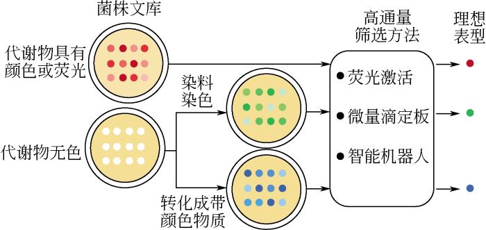 ... 另外,如果代谢物本身是无色或者缺乏荧光,还可以采用如下改进方案进行筛选.①使用可与代谢物反应产生颜色或荧光的添加试剂.例如,Lee等[21]使氟硼二吡咯与聚-3-羟基丁酸酯反应产生荧光,并且结合高速流式细胞分析仪,实现了对大肠杆菌内聚-3-羟基丁酸酯更高灵敏度的检测.②引入外源酶将细胞代谢物转化成有颜色的化学物质.例如,Deloache等[22]在酿酒酵母体内引入来自植物的二羟基苯丙氨酸双加氧酶(dihydroxyphenylalanine dioxygenase,DOD),它能够将L-多巴(L-3,4-dihydroxyphenylalanine,L-DOPA) 转化为带有黄色荧光的甜菜黄素,并且发现黄色荧光强度与细胞内L-多巴的浓度具有较强的相关性,从而可以通过肉眼直接进行分辨筛选L-多巴高产菌株.运用这种筛选策略,研究人员快速地从突变文库中筛选到一株L-多巴产量比野生菌株提高2.8倍的阳性突变体.同时该策略的建立也为生产无颜色代谢物细胞工厂的筛选提供了高效可行的筛选方法. ...
