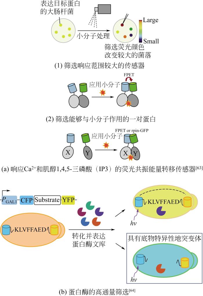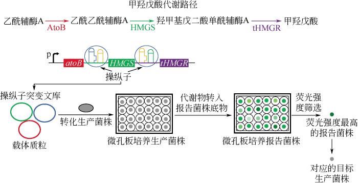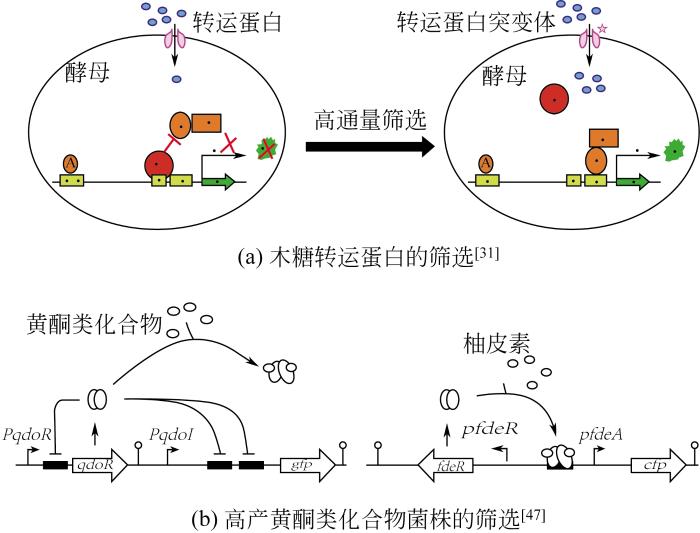 ... 在微生物生产的化学品中,只有少数可以通过颜色或者荧光的筛选方法直接进行筛选.许多化学物质本身不具有颜色或荧光,甚至难以转化为易于染色或者有颜色的物质.在微生物体内广泛存在一类蛋白质或RNA,它们能够识别并响应细胞内特定的代谢物,并转化为特定的信号输出[27](如荧光、细胞的生长、代谢通路的开闭),通过信号强度检测细胞代谢物浓度.基于这一原理,研究人员开发了一系列生物传感器的筛选方法,用于菌种进化工程突变文库的高通量筛选. ...