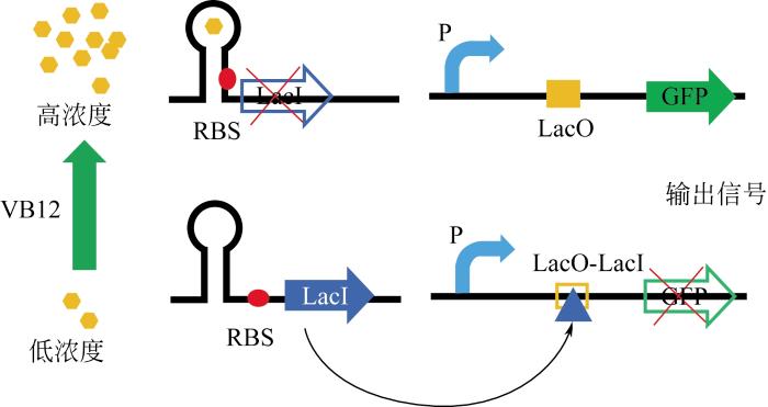 ... 在翻译水平上,核糖体开关感应代谢物并调节mRNA的二级结构,使RBS位点暴露或者隔离,进而促进或者抑制相关报告基因的表达.基于这种机制,合成的核糖开关已被设计用于感知一系列代谢物,包括氰尿二酰胺[50]、6-磷酸葡糖胺[51]、茶碱[57].在一项研究中,Cai等[52]引入来自鼠伤寒沙门氏菌的调控装置第一次在苜蓿根瘤菌体内构建了核糖体开关,用来筛选高产VB12的优良突变菌株(图6).当VB12浓度较高时,核糖体开关RBS序列被隔离,LacI蛋白表达被抑制,绿色荧光蛋白表达增强.当VB12浓度较低时,核糖体开关RBS序列暴露,LacI蛋白正常表达,与LacO操纵子结合抑制绿色荧光蛋白表达.通过建立核糖体开关高通量筛选系统,研究人员成功获得了一株优良的阳性突变体,VB12产量比野生型提高了21.9%. ...