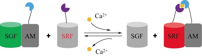 目前基于荧光共振能量转移原理开发的生物传感器能够响应多种重要的代谢物,如 6-磷酸海藻糖[59]、蛋氨酸[60]、 亮氨酸[61]、抗生素[62]、谷氨酰胺[65]、维生素B12[66]和谷胱甘肽[67].在此基础上,为了扩大荧光共振能量转移生物传感器应用的范围和实现更复杂的响应功能,Ding等[68]开发了一种新型荧光共振能量转移生物传感器(图8),用于细胞内Ca2+浓度的监测.该传感器由一对特殊的荧光基团SGF和SRF组成,在单独存在时,两种荧光基团均不发光,只有当与第3种激活单体(activating monomer,AM)竞争性结合时,才会发光.AM和SRF都连接有受体蛋白,当缺乏配体小分子时,AM只能选择性地与SGF结合,发出强烈的绿色荧光.当小分子配体存在时,将AM转移与SRF结合,使能量发生转移,激活红色荧光,从而可以根据红绿荧光比率,检测细胞内目标小分子代谢物的浓度. ...