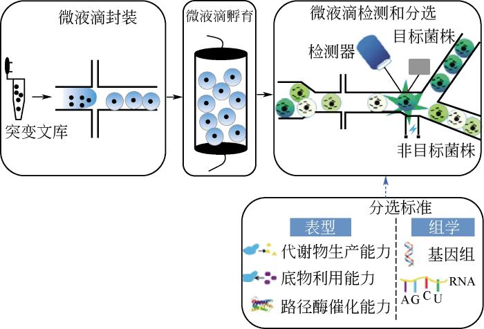... 液滴微流体平台有单细胞分离良好的隔室,可以作为微反应器进行细胞的恒化培养、蛋白表达分析、代谢物检测和组学分析,为菌种进化工程高通量筛选提供了有利的技术支撑.与传统高通量筛选技术相比,液滴微流体技术表现出更高的通量和精度,大大降低了筛选时间和成本,可以同时分析多达150万个样本[69],并具有快速引入环境扰动的能力,提供动态的微环境条件控制,显著提高了研究人员对微生物体系进行控制和筛选的能力,为菌种进化工程获得理想的微生物菌株提供了有力的工具.因为荧光信号检测具有很高的灵敏度,特别适合作为液滴微流体平台皮升级微反应器的检测信号,所以目前微流控技术主要将代谢物的浓度、路径酶催化能力、组学检测等和荧光信号偶联,通过荧光信号对菌株表型和组学进行筛选(图9). ...